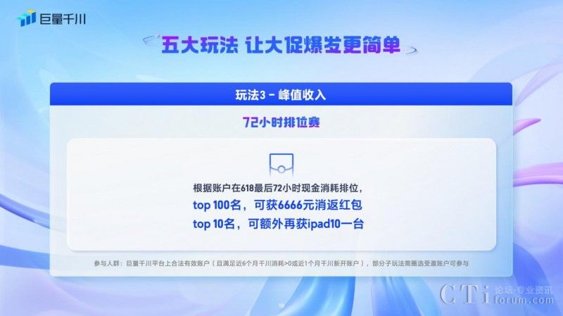 三、「72小時排位賽 」:針對巨量千川平臺上合法有效賬號,且滿足近6個月千川消耗>0或近1個月千川新開賬戶,按照商家的峰值收入可以參與72小時排位賽,根據(jù)賬戶在618最后72小時現(xiàn)金消耗進行排位,排位Top100的商家可得6666元消返紅包,Top10可額外再得ipad10一臺。
