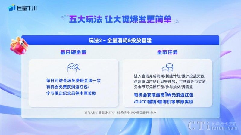 二、「每日砸金蛋&金幣任務」:針對在618好物節(jié)期間現(xiàn)金消耗對比基準期消耗增長率未達標的商家,可參與每日砸金蛋和金幣任務。商家每日可進入會場免費砸金蛋一次,就有機會免費獲得消返紅包和字節(jié)限定紀念品等獎勵。此外,商家進入會場完成消耗/新建計劃/累計投放天數(shù)/創(chuàng)建重點產(chǎn)品計劃等任務,可獲取金幣獎勵,憑金幣可兌換紅包、參與抽獎和拆盲盒等豐厚獎勵,最高可得10000元消返紅包。