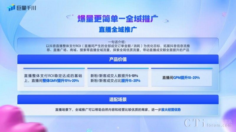 獲取生意增量是商家生意經(jīng)營的重中之重,升級后的全域推廣分為直播全域推廣和商品全域推廣,讓爆量變得更簡單。直播全域推廣打通廣告和自然流量,以抖音直播整體ROI為優(yōu)化目標,拓展抖音信息流推薦、直播廣場、商城、搜索等直播全域流量,帶動直播成交額全面提升,放大直播生意,直播間整體GMV提升15%~20%,新客/新粉成交占比提升15%~20%。