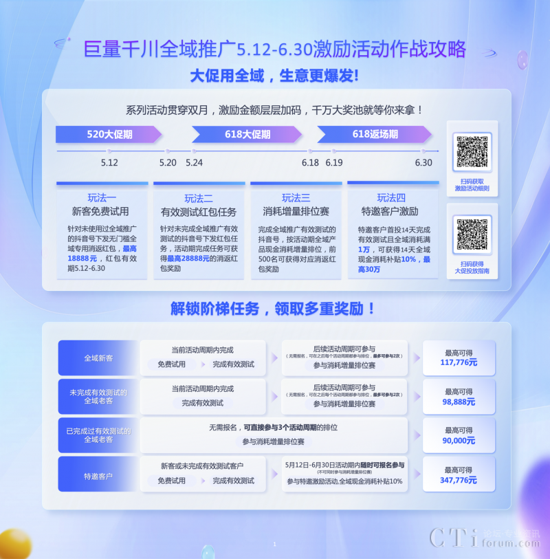 在此次巨量千川618好物節(jié)期間,全域推廣系列活動貫穿雙月,激勵金額層層加碼,更有多重獎勵,獎池金額累積千萬。全域推廣針對全域新客發(fā)放高達18888元的全域推廣專屬紅包;對于未完成全域有效測試的商家在活動期完成有效測試任務可獲得最高28888元的消返紅包;以及參與全域推廣消耗排位賽,最高可得50000元消返紅包;對于特邀客戶首投14天完成有效測試且全域消耗滿1萬,可獲得14天全域現(xiàn)金消耗補貼10%,最高達30萬。
