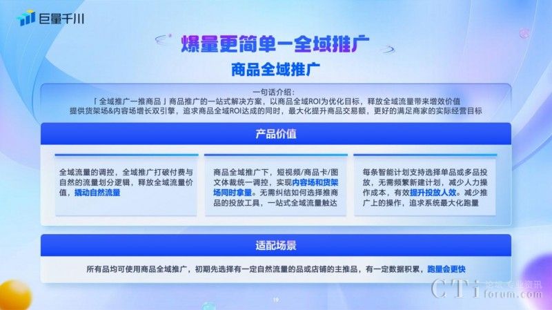 此外,商品全域推廣為商品推廣提供一站式解決方案,是以商品全域ROI為優(yōu)化目標,釋放全域流量帶來的增效價值,提供貨架場、內(nèi)容場增長雙引擎,幫助客戶在追求商品全域ROI達成的同時,最大化提升商品交易額,更好的滿足客戶的實際經(jīng)營目標。在商品全域推廣下,短視頻/商品卡/圖文體裁統(tǒng)一調(diào)控,無需糾結(jié)選擇推廣商品的投放工具,一站式全域流量觸達。