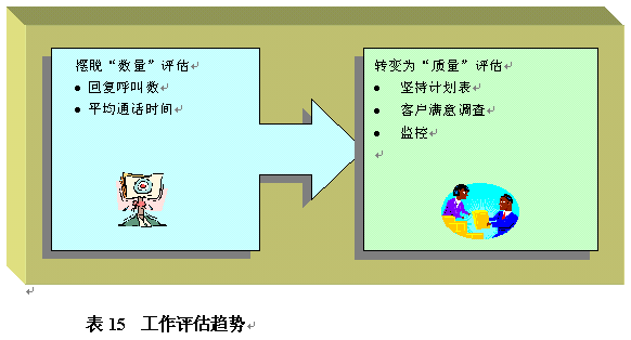 。。這些年呼叫中心工作評估經(jīng)歷了一些變化。最新趨勢是擺脫死板的"數(shù)量"評估,例如回復(fù)呼叫數(shù),通過客戶滿意度調(diào)查和監(jiān)控進(jìn)行數(shù)量評估以外的更全面的質(zhì)量評估。在表14中指出這種最新的工作評估趨勢的原因是,大量數(shù)量評估,例如回復(fù)呼叫數(shù),實(shí)際上已經(jīng)不能使員工在其基礎(chǔ)上進(jìn)行改善。例如,一個每小時接聽十個呼叫的員工并不比每小時僅接聽五個呼叫的員工效率更高。呼叫中心管理者評估員工工作更好的辦法是在這種數(shù)量評估中加入額外的質(zhì)量評估。