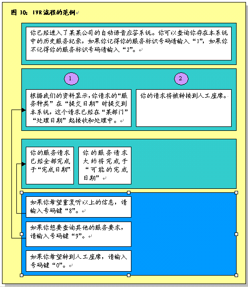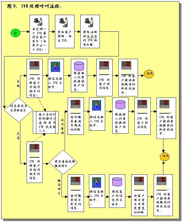 根據(jù)呼叫處理部分所作的說明,在完成初次聯(lián)絡過程之后,服務代表將確定呼叫者的需要。之后服務代表將協(xié)助呼叫者或者使其選擇IVR系統(tǒng),該系統(tǒng)通過自動為這些請求錄音提供相關(guān)的信息和服務。服務代表將接受培訓識別哪些交易服務和信息服務可以通過IVR進行,這樣他們可以使呼叫者選擇自我服務。圖9圖示了用這一辦法處理呼叫的過程。