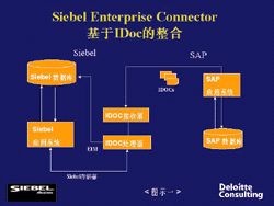 在這個名為Siebel Enterprise Connector的中間軟件中,這種整合通過兩個方法來實現(xiàn)。一是通過中間文件(Intermediate Document IDoc)實現(xiàn)的整合(圖示一),它可以把SAP中的基本信息輸入到Siebel中,其中IDocs接收器接收從SAP服務(wù)器中存儲的關(guān)于客戶戶口、聯(lián)系人、產(chǎn)品和價格等信息,然后把這些信息存入IDocs界面中,這個界面是Siebel的整合管理(Enterprise Integration Manager,EIM)的一部分,于是這些信息就可以完全傳入到Siebel中。這樣的整合不僅在CRM最初啟動的時候可以用來進行數(shù)據(jù)轉(zhuǎn)化,而且在ERP和CRM的同步運行中還能不斷地把最新調(diào)整的產(chǎn)品目錄、價格和折扣等信息輸入到前端軟件中,讓銷售人員可以及時地給出正確的報價。