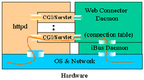 所有來(lái)自客戶端的請(qǐng)求(瀏覽器和Applet)都首先發(fā)送給Web Server(HTTP Daemon),然后由httpd啟動(dòng)相應(yīng)的CGI/servlet擴(kuò)展,CGI/servlet模塊僅對(duì)上傳的數(shù)據(jù)進(jìn)行簡(jiǎn)單的檢查和打包工作然后就傳給Web Connector Daemon,CGI/servlet模塊本身并不處理連接,它是以一種無(wú)連接的方式轉(zhuǎn)發(fā)一個(gè)請(qǐng)求再回送應(yīng)答。連接的維持和記錄由Web Connector Daemon建立起連接記錄表來(lái)完成。