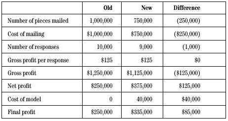 請(qǐng)注意,郵寄的純利潤(rùn)增加了$125,000,甚至你扣除由于數(shù)據(jù)采集而產(chǎn)生的軟件、硬件即人力資源方面的$40,000,純利潤(rùn)還增加了$85,000。建模的投入轉(zhuǎn)化成了200%的收益,這遠(yuǎn)遠(yuǎn)超過(guò)了BB&CC對(duì)這一項(xiàng)目的ROI要求。
