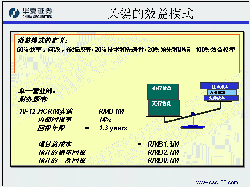 華夏證券經(jīng)紀業(yè)務(wù)總部的姚磊作為唯一的成功應(yīng)用案例代表,主要是和與會的金融機構(gòu)分享在客戶關(guān)系管理規(guī)劃方面的一些成功經(jīng)驗。華夏證券認為,對于證券公司的經(jīng)紀業(yè)務(wù)來講,客戶關(guān)系管理的主要目標應(yīng)該是把客戶關(guān)系管理系統(tǒng)的核心功能融入開戶、交易、服務(wù)、咨詢等四個與客戶互動的過程之中,比如:客戶資料規(guī)戶整合形成統(tǒng)一的客戶號,管理客戶交易偏好和產(chǎn)品偏好上的變化,配合多種渠道建立一對一銷售流程,客戶終身價值管理。在風險控制方面,華夏證券同樣貢獻了寶貴的經(jīng)驗,在這方面他們認為最重要的方面是要做好高層領(lǐng)導的灌輸和培訓工作,讓企業(yè)的高層領(lǐng)導對于客戶關(guān)系管理有一個正確的理解,從而對于項目的投資有一個合理的預期和實證,通俗一點說,就是首先為整個項目找一個合適的發(fā)起人。第二點要注意,要有專業(yè)的項目管理隊伍,這其實就是集成商選擇方面的風險。除此之外,還要對項目要有一個明確的定義,關(guān)注每一步提交的結(jié)果,在項目過程中就隨時發(fā)現(xiàn)問題、解決問題。