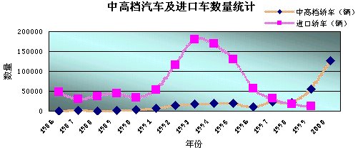 第三階段:1999年以后的快速增長階段。1999年中高檔汽車產(chǎn)銷量結(jié)束了六年的徘徊局面,首次突破5萬輛,比上年增長了1.5倍,在轎車市場中的占有率升到9.7%。2000年中高檔汽車的產(chǎn)量又實現(xiàn)翻倍,增長率為232.46%,年產(chǎn)量達(dá)到127,676臺。進(jìn)口中高檔汽車數(shù)量也超過了3萬臺,僅日本車的進(jìn)口量就達(dá)23,502臺。