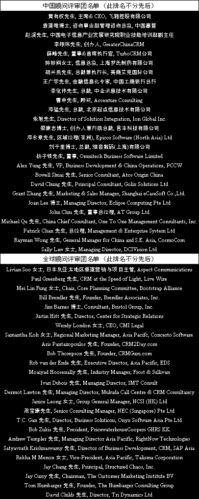 五、 權(quán)威性。GreaterChinaCRM邀請?jiān)摍C(jī)構(gòu)50多位(包括中國和外國)最權(quán)威的CRM專家擔(dān)當(dāng)此次評選的評審團(tuán)。