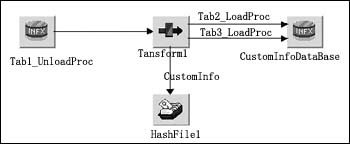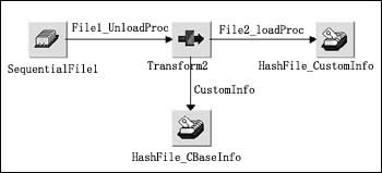 由于不同的源數(shù)據(jù)中可能包含同一個客戶的信息,因此采用Hashed File Stage HF_khjbxx存放輸出結(jié)果,相同客戶的信息根據(jù)客戶編碼覆蓋前面產(chǎn)生的信息,避免了重復(fù)的客戶信息。從不同源數(shù)據(jù)庫取得客戶信息,根據(jù)數(shù)據(jù)的真實性依次進行處理后,生成的客戶信息全部保存在一個Hash文件中,最后從Hash文件中取出結(jié)果數(shù)據(jù)裝載到目標(biāo)數(shù)據(jù)庫中。