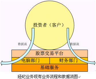 。。從上圖可以看出,現(xiàn)在的證券公司的經(jīng)紀(jì)業(yè)務(wù)為各個(gè)股民或者說投資者所提供的服務(wù)就是交易平臺(tái)的服務(wù),也就是交易通道服務(wù)。營業(yè)部的其他服務(wù)都是為這個(gè)交易通道服務(wù),這些服務(wù)品種都是非;A(chǔ)的。而營業(yè)部的數(shù)據(jù)流,也就是各個(gè)客戶的基本信息和交易信息,通過電腦部和財(cái)務(wù)部門就走到了終結(jié),沒有被更好的利用。