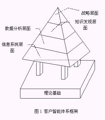 客戶智能系統(tǒng)(CI System)是本文提出的實(shí)現(xiàn)客戶智能的系統(tǒng)平臺。它包括了客戶智能體系中的信息系統(tǒng)層面、數(shù)據(jù)分析層面、知識發(fā)現(xiàn)層面,是基于客戶智能理論的可操作的系統(tǒng)框架。因此,客戶智能體系也可以簡單地用客戶智能基礎(chǔ)理論和基于客戶智能理論的客戶智能系統(tǒng)兩個邏輯層面表示(圖2);诳蛻糁悄艿腃RM系統(tǒng)是本文描述的客戶智能系統(tǒng)中的一種。