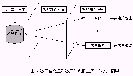 客戶知識是人們通過實(shí)踐認(rèn)識到的、與客戶有關(guān)的規(guī)律性,而客戶智能是獲得客戶知識并使用客戶知識求解問題的能力?蛻糁悄苁菍ζ髽I(yè)戰(zhàn)略決策真正有價值的事物和行動?蛻糁悄懿粌H包括了客戶知識的生成,而且更強(qiáng)調(diào)了客戶知識在企業(yè)中的分發(fā)、使用,直到產(chǎn)生客戶智能。所以,客戶智能是對客戶知識的生成、分發(fā)和使用(圖3)。