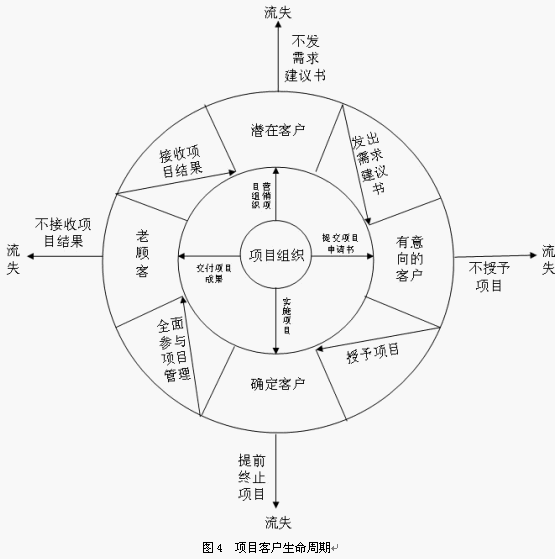 需要特別注意的一點是,在項目的整個生命周期中,如果客戶不滿意項目組織提供的服務,將會離開項目組織,造成客戶流失。