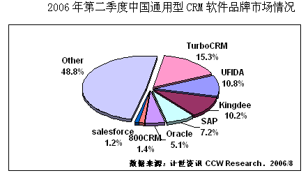 計世資訊(CCW Research)數據顯示,2006年二季度中國CRM軟件市場規(guī)模達2.25億元人民幣,比去年同期增長20.1%,其中通用型CRM軟件市場規(guī)模為0.80億元,占總體CRM市場份額的35.5%。