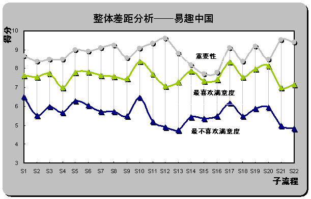 2) 重要流程欠缺最優(yōu)體驗。雖然易趣中國被認(rèn)為是最不喜歡的在線銷售網(wǎng)站,但從滿意度評分也同時可以發(fā)現(xiàn),易趣中國在S1(瀏覽速度),S16(個人定制促銷信息的發(fā)布)和S15(個性化頁面設(shè)置)還是為用戶設(shè)計了相對較好的體驗。但重要性得分排名前三位的子流程中,S12(產(chǎn)品質(zhì)量可靠)、S21(退換貨服務(wù))和S22(客戶投訴和反饋)仍為重要性與滿意度差距最大的三個子流程,易趣中國也未在重要流程上為用戶設(shè)計優(yōu)越的在線體驗。