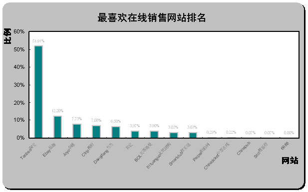 China和貝塔斯曼BOL成為“最不喜歡在線銷售網(wǎng)站”的前兩名,分別有19.77%和18.40%被調(diào)查者選擇易趣和貝塔斯曼作為“最不喜歡在線銷售網(wǎng)站”,兩家網(wǎng)站以相對較大的比例領(lǐng)先與其他各在線銷售網(wǎng)站。雖然淘寶以巨大的優(yōu)勢成為“最受歡迎的在線銷售網(wǎng)站”,但同時也可以發(fā)現(xiàn),仍有8.08%的被調(diào)查者選擇淘寶作為“最不喜歡在線銷售網(wǎng)站”,其它“最不喜歡在線銷售網(wǎng)站”比例相對較大的還有為當(dāng)當(dāng)(7.79%)。