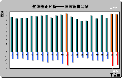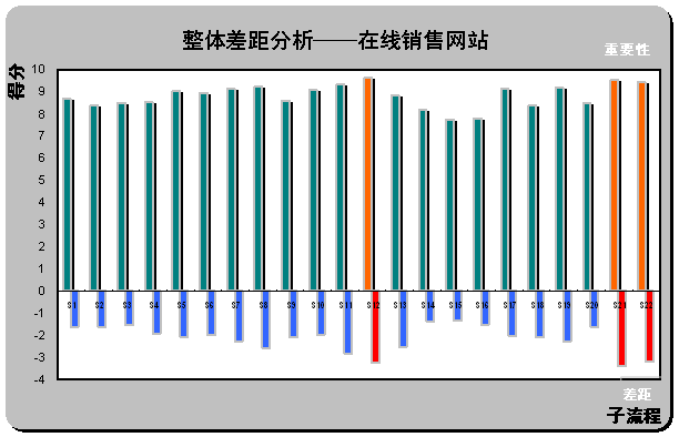 (2)整體差距分析(Gap Analysis)。請見上圖X軸下方所示,計算所有被調(diào)查對所列在線銷售網(wǎng)站的滿意度平均值(綜合最喜歡在線銷售網(wǎng)站和最不喜歡在線銷售網(wǎng)站的滿意度,計算被調(diào)查者對22個子流程的滿意度評分)。通過計算重要性和滿意度的差距,首先,一個有趣的現(xiàn)象,在著色的三個差距最大的子流程剛好也是重要性得分排名前三位的流程S12,