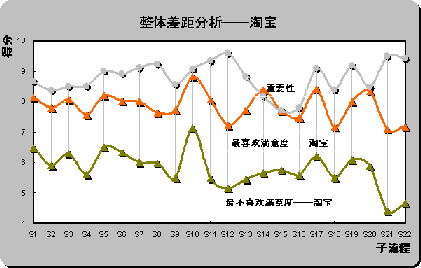 2) 體驗最優(yōu)流程。從滿意度曲線和重要性曲線的差距分析可以得出,在選擇其作為最喜歡在線銷售網(wǎng)站被調(diào)查者中,淘寶在S14(個人購買歷史回顧)流程上的滿意度高于重要性,在這個流程上,淘寶為用戶提供了非常優(yōu)越的在線體驗。