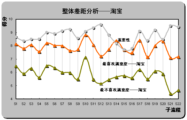 S12(產(chǎn)品質(zhì)量可靠)和S22(客戶投訴和反饋),具體差距分別為2.44,2.38和2.22。也是重要性評分排名前三位的子流程。雖然淘寶成為用戶最喜歡的在線銷售網(wǎng)站,但在重要子流程上并未為用戶設(shè)計最佳體驗。