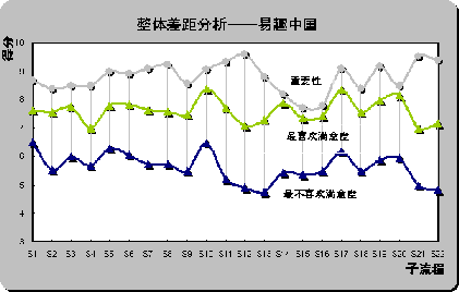 從前面分析可知,易趣以19.77%的比例成為最不喜歡在線銷售網(wǎng)站,選擇被調(diào)查者對子流程評分——最喜歡、最不喜歡在線銷售網(wǎng)站滿意度曲線與重要性曲線進行差距分析。