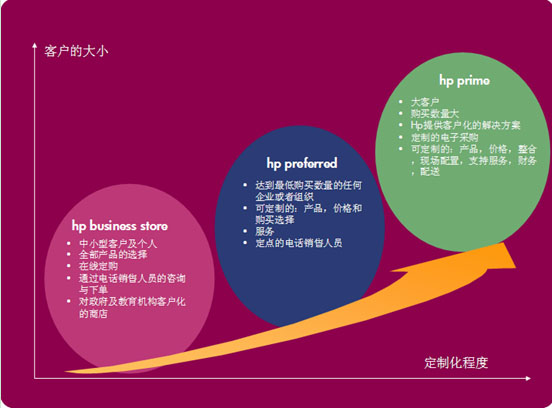 從圖中我們可以看出,對(duì)于不同類(lèi)型的客戶(hù),Business Store, HP Preferred, Hp Prime供其選擇。其中HP