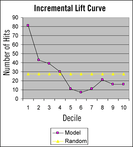 在增量提升曲線中標示了各個分段的命中數(shù)。 在圖1中可以看到,增量提升曲線在第4個分段后和隨機期望線(275個響應(yīng)的10%,即平均每個分段27.5個響應(yīng))交叉。