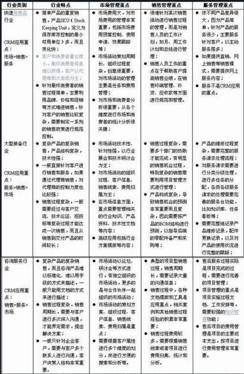 從以上簡單的分析過程我們可以看出由于企業(yè)所處行業(yè)特點的不同,導(dǎo)致在市場、銷售和服務(wù)方面對CRM主要功能需求差別非常大。企業(yè)在實際選型過程中,還需要對行業(yè)再進(jìn)行細(xì)分分析,比如在快速消費品中,洗滌用品行業(yè)和牛奶乳業(yè)行業(yè)在客戶服務(wù)的主要需求等方面就有比較大的差別,這些都需要細(xì)致的分析。
