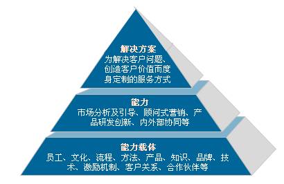 解決方案導(dǎo)向型企業(yè)在整個(gè)經(jīng)營過程中積極倡導(dǎo)上述觀念,并在向客戶的服務(wù)過程中身體力行,這需要企業(yè)具備哪些核心的能力,這些能力又該如何獲取呢?看看下圖中的解決方案型企業(yè)能力金字塔: