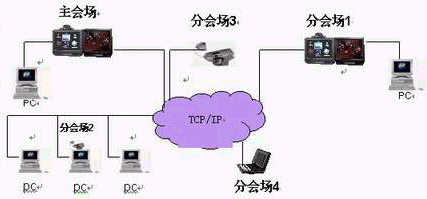 可視化Ip電話會議系統(tǒng): 是利用計算機,多媒體通信技術和設備,通過傳輸信道在兩地或多個地點之間開會的一種通信手段。在召開會議時,處于兩地或不同地點的與會代表,既可以聽到對方的聲音,又可以看到對方的形象,同時還能看到對方會議室的場景,以及在會議中展示的事物、圖片、表格、文件等,縮短了與會代表的距離,使大家好像在同一會議室參加會議一樣。它的廣泛應用必然產生巨大的社會效益和經濟效益。系統(tǒng)結構簡圖如下:
