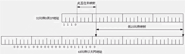 D類地址的最后28比特沒有結構化,即沒有網絡ID和主機ID之分。響應某一個IP多播地址的主機構成一個主機組,主機組可跨越多個網絡。主機組的成員數(shù)是動態(tài)的,主機可以通過IGMP協(xié)議加入或離開某個主機組。IP多播地址影射到以太網地址的方法見下圖。因為IP多播地址的高5位未影射,因此,影射的以太網地址不是唯一的,共有32個IP多播地址影射到一個以太網地址。
