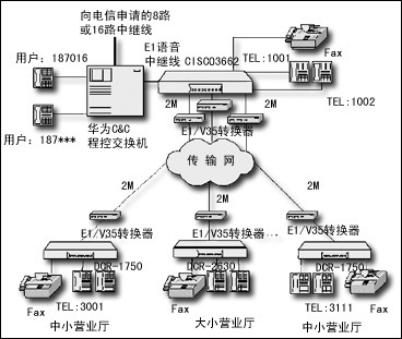 市聯(lián)通通過在Cisco 3662路由器上配置一個NM-HDV-1E1-30E語音中繼模塊,通過75歐姆同軸電纜與華為程控交換機的E1接口板相連,提供30路話音,該路由器用作語音網(wǎng)關。各網(wǎng)點配置神州數(shù)碼路由器,配置MR-VIC-2FXS或MR-NM-4FXS語音模塊,提供多路語音。