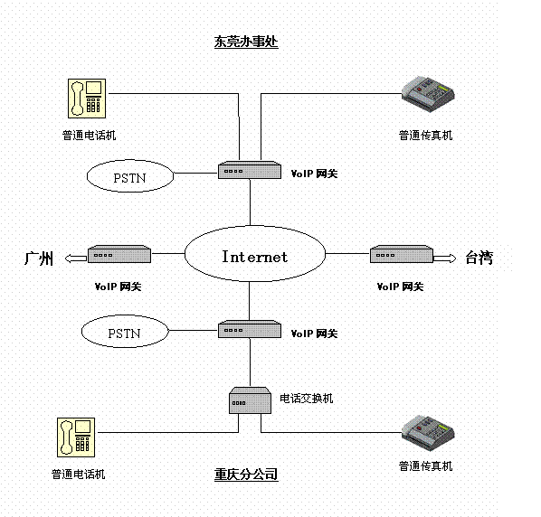 有一家臺(tái)商公司,在臺(tái)灣、東莞、廣州和重慶自己的分支機(jī)構(gòu),相互之間有大量的通話(huà)聯(lián)系,特別是研發(fā)部門(mén),其通話(huà)量更是非常大。因此試圖在各個(gè)地方之間使用IP電話(huà)來(lái)降低通訊支出。在實(shí)施IP電話(huà)服務(wù)之前,各個(gè)地方都擁有完善的局域網(wǎng),并且申請(qǐng)了固定IP的寬帶接入。并且在辦公室內(nèi)部署了程控電話(huà)交換機(jī)。