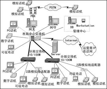 當中國電信、中國聯(lián)通等運營商的IP電話網(wǎng)對外開放時,該網(wǎng)上的數(shù)字電話可通過網(wǎng)守認證直接連入各運營商的IP電話網(wǎng),已有的模擬電話通過與市局中心的程控交換機PBX相連的IP電話網(wǎng)關(guān)進入各運營商的IP電話網(wǎng),撥打長途電話時只需支付IP電話結(jié)算費(比現(xiàn)在市面上的IP電話費便宜很多)。在市局中心設(shè)有網(wǎng)守和管理中心,控制和接續(xù)各話音呼叫,并對系統(tǒng)進行管理。