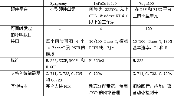 企業(yè)這部分市場與通信公司那部分不同。第一,企業(yè)不需要運(yùn)載公眾呼叫,因此產(chǎn)品的規(guī)模較小。第二,企業(yè)愿意用連接到公司內(nèi)部網(wǎng)絡(luò)的IP電話產(chǎn)品代替?zhèn)鹘y(tǒng)的PBXs,因此這部分產(chǎn)品必須提供基本的PBX功能,比如呼叫保持和呼叫轉(zhuǎn)移。表2是一些相關(guān)的產(chǎn)品。