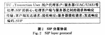 SIP本身是一種分層協(xié)議,如圖2所示。由此可見,SIP采用C/S結構,通過MESSAGE機制來建立會話。因為SIP處理的是客戶端與服務器之間的請求和響應,所以SIP消息包括了請求消息和響應消息。二者都具有相同的消息格式: