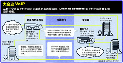 Lehman Brothers利用Cisco CallManager IP PBX向全球的雇員提供語音服務。該公司的IP PBX位于公司在曼哈頓和新澤西城的冗余數(shù)據(jù)中心內(nèi)。公司從2001年初先期部署了容量為50部電話的VoIP網(wǎng)絡。該系統(tǒng)在當年年中時已經(jīng)增容至1000個用戶。目前,這套VoIP網(wǎng)絡已經(jīng)增加至8000個IP電話,用戶遍及紐約地區(qū)、英國和日本。該公司負責網(wǎng)絡服務的副總裁John