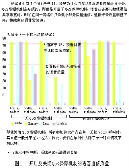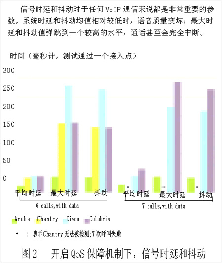 而當(dāng)我們通過一個接入點或交換機傳送6到7個并行VoIP呼叫時,尤其是加入了數(shù)據(jù)通信業(yè)務(wù)后,所有產(chǎn)品的系統(tǒng)性能顯著降低。另外,當(dāng)開通7個并行VoIP呼叫和關(guān)閉QoS保障機制時,即使沒有加入數(shù)據(jù)業(yè)務(wù), Colubris設(shè)備也幾乎都處于通話中斷的狀態(tài)。因此,我們無法得到任何測試數(shù)據(jù)(如圖1所示)。
