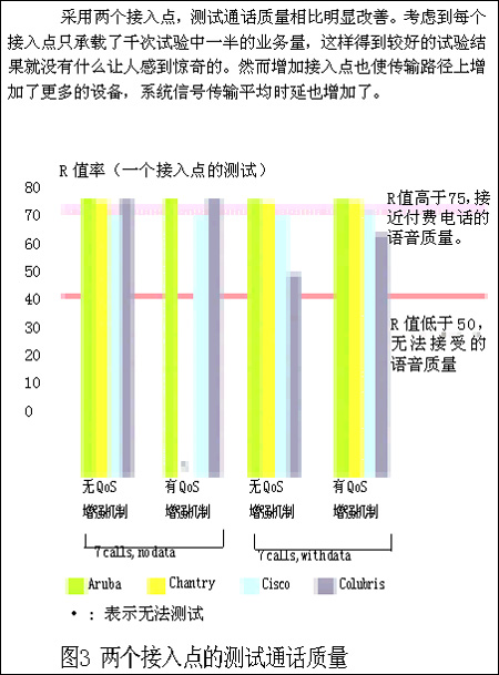 而其他供應(yīng)商的設(shè)備在開啟QoS保障機制的情況下,一旦加入數(shù)據(jù)流業(yè)務(wù),就很難保證通話質(zhì)量。從正面來看,在只有語音傳輸業(yè)務(wù)的情況下,QoS保障機制一般運行較好。當(dāng)我們只承載語音傳輸時,所有系統(tǒng)的音頻質(zhì)量都改善了。在不加入數(shù)據(jù)流情況下測試6個或7個并行VoIP呼叫,所有的系統(tǒng)都能夠取得和付費電話一樣的通話質(zhì)量。但當(dāng)我們加入數(shù)據(jù)流業(yè)務(wù),一切都改變了。在承載6個并行VoIP呼叫并加入數(shù)據(jù)流業(yè)務(wù)的情況下,Colubris CN1250系統(tǒng)的R值衰落到70以下。根據(jù)ITU的R值標準,這說明一些用戶的通話質(zhì)量不令人滿意。Chanrty的R值在60左右,這個結(jié)果將不能令用戶滿意。除了客觀的R值評分以外,我們還進行了一些主觀的通信質(zhì)量監(jiān)聽,當(dāng)加入了數(shù)據(jù)流業(yè)務(wù)以后,我們聽到了大量的回聲,掉線頻繁?傊,只要測試點加入數(shù)據(jù)業(yè)務(wù)流,上面描述的情況就會出現(xiàn),通話質(zhì)量通常變得惡劣。