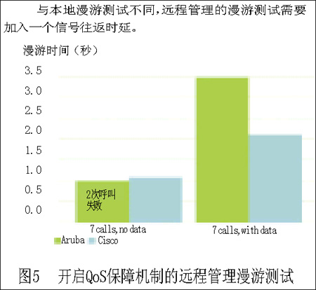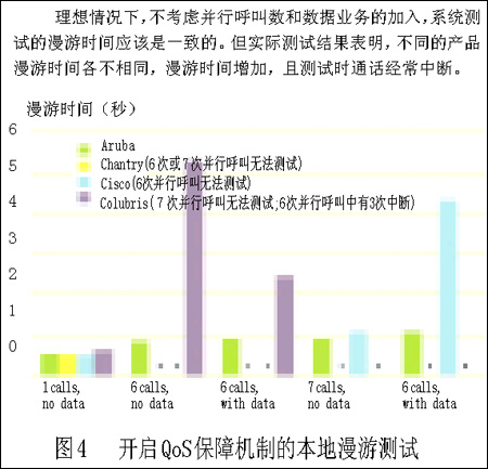 Aruba公司的設(shè)備在漫游測試中表現(xiàn)出色,它的平均漫游切換時間在0.5~1秒之間,雖然這已經(jīng)是所有的測試設(shè)備中表現(xiàn)最好的,但是通話者還是能夠察覺這種時延。而Cisco公司的設(shè)備,由于時間的限制,我們只進行了7個并行呼叫的漫游測試,平均漫游時間為0.433秒到1.053秒,而加入數(shù)據(jù)流業(yè)務(wù)時,在7個并行VoIP呼叫時,系統(tǒng)的時延達到了4.324秒。