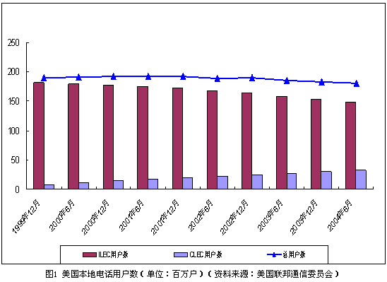 就整體而言,美國(guó)本地電話(huà)用戶(hù)總量穩(wěn)中有降,移動(dòng)通信的替代作用開(kāi)始顯現(xiàn)。截止到2004年6月,包括住宅和商業(yè)用戶(hù),美國(guó)本地電話(huà)用戶(hù)總量達(dá)到1.81億戶(hù)。但與3年前相比,美國(guó)本地電話(huà)用戶(hù)數(shù)量實(shí)際減少了近1200萬(wàn)戶(hù)。與此同時(shí),移動(dòng)用戶(hù)數(shù)量迅速增長(zhǎng)。截止到2004年6月,美國(guó)移動(dòng)電話(huà)用戶(hù)數(shù)比上年同期增長(zhǎng)13%,達(dá)到1.673億戶(hù),基本接近固定電話(huà)用戶(hù)的數(shù)量。