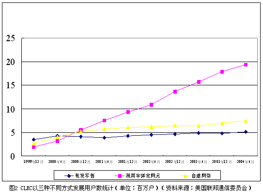 從經(jīng)營(yíng)模式上看,本地非主導(dǎo)運(yùn)營(yíng)商的商業(yè)模式在過(guò)去的5年中發(fā)生了很大變化。在市場(chǎng)剛剛開(kāi)始引入競(jìng)爭(zhēng)的1999年,42.9%的本地非主導(dǎo)運(yùn)營(yíng)商選擇了批發(fā)零售這種進(jìn)入門(mén)檻相對(duì)較低的商業(yè)模式,本地電話(huà)市場(chǎng)一度活躍著大量地區(qū)性的小運(yùn)營(yíng)商。由于面臨本地主導(dǎo)運(yùn)營(yíng)商的強(qiáng)烈抵制,非綁定網(wǎng)元政策的實(shí)施自公布以來(lái)一再推遲,經(jīng)過(guò)反復(fù)的法律訴訟,美國(guó)最高法院在2002年最終裁定非綁定網(wǎng)元政策合法。自那時(shí)起,AT&T、MCI等全國(guó)性的長(zhǎng)途電話(huà)運(yùn)營(yíng)商紛紛通過(guò)租用非綁定網(wǎng)元的方式進(jìn)入本地電話(huà)市場(chǎng)。截止到2004年6月,本地主導(dǎo)運(yùn)營(yíng)商已經(jīng)提供了約2150萬(wàn)線(xiàn)非綁定本地用戶(hù)線(xiàn)給本地非主導(dǎo)運(yùn)營(yíng)商。CLEC以三種方式發(fā)展用戶(hù)的情況如圖2所示。