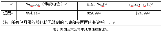 隨著寬帶接入的進(jìn)一步普及,VoIP似乎為打破本地環(huán)路的瓶頸提供了新的選擇,AT&T、Qwest、時(shí)代華納、Verizon等老牌運(yùn)營(yíng)商紛紛開(kāi)始提供這項(xiàng)服務(wù)。AT&T于2004年3月在新澤西州和德克薩斯州推出了29.99美元的包月計(jì)劃,其VoIP業(yè)務(wù)不僅包含了基本語(yǔ)音服務(wù),也提供諸如呼叫轉(zhuǎn)移、會(huì)議電話(huà)、來(lái)電顯示等增值服務(wù),美國(guó)三大公司本地電話(huà)資費(fèi)如表1所示。