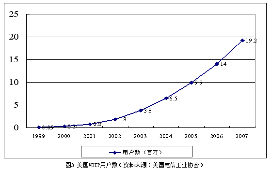 與此同時(shí),Qwest也開(kāi)始在明尼蘇達(dá)州提供類(lèi)似的VoIP業(yè)務(wù),并計(jì)劃在近期內(nèi)推向全國(guó)。Verizon與北電網(wǎng)絡(luò)簽訂了大筆的訂單,計(jì)劃全面改造其本地電話(huà)網(wǎng)絡(luò)提供的VoIP業(yè)務(wù)。一些曾經(jīng)著名的網(wǎng)絡(luò)電話(huà)公司(如Net2Phone)也開(kāi)始進(jìn)入傳統(tǒng)電話(huà)市場(chǎng)。截止到2004年2月底,Vonage的全I(xiàn)P網(wǎng)絡(luò)已經(jīng)擁有13萬(wàn)VoIP用戶(hù)。據(jù)美國(guó)電信工業(yè)協(xié)會(huì)預(yù)測(cè),到2007年年末,全美的VoIP用戶(hù)將會(huì)達(dá)到1920萬(wàn)戶(hù),如圖3所示。