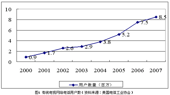 隨著有線(xiàn)電視用戶(hù)數(shù)量逐漸達(dá)到飽和,有線(xiàn)電視公司也在積極尋找新的利潤(rùn)增長(zhǎng)點(diǎn)。在過(guò)去的7年中,有線(xiàn)電視公司投入了高達(dá)800億美元的資金用于網(wǎng)絡(luò)升級(jí)改造,現(xiàn)在,大部分有線(xiàn)電視網(wǎng)絡(luò)已經(jīng)可以提供包括寬帶接入、本地和長(zhǎng)途電話(huà)、數(shù)字電視、視頻點(diǎn)播等在內(nèi)的一攬子服務(wù)。到2004年末,有線(xiàn)電視公司已經(jīng)擁有超過(guò)380萬(wàn)的本地電話(huà)用戶(hù)。根據(jù)美國(guó)電信工業(yè)協(xié)會(huì)的估算,到2007年,全美將會(huì)有超過(guò)800萬(wàn)的用戶(hù)選擇基于有線(xiàn)電視網(wǎng)的基本電信業(yè)務(wù),如圖4所示。