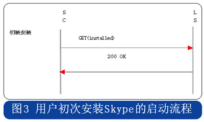 Skype的用戶終端啟動(dòng)時(shí),采用HTTP協(xié)議連接到注冊(cè)服務(wù)器,用戶初次安裝的啟動(dòng)流程中攜帶“installed”的參數(shù),使用時(shí)啟動(dòng)流程則在消息中攜帶“getlatestversion”參數(shù),具體流程分別見圖3和圖4。
