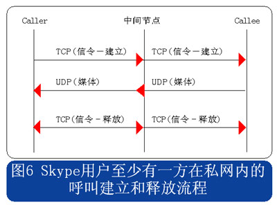 從上述流程圖可見,Skype的呼叫信令都采用TCP封裝,而媒體流則使用UDP封裝,當(dāng)有任何一方用戶位于限制UDP包的防火墻內(nèi)時(shí),媒體流就會(huì)采用TCP封裝。另外當(dāng)Skype用戶至少有一方位于私網(wǎng)內(nèi)時(shí),所有的信令和媒體消息都經(jīng)過一個(gè)或多個(gè)中間節(jié)點(diǎn)轉(zhuǎn)發(fā)。此時(shí)無需擔(dān)心用戶通話的媒體流因?yàn)榻?jīng)過中間節(jié)點(diǎn)轉(zhuǎn)發(fā)而被竊聽,因?yàn)镾kype采用了對(duì)消息進(jìn)行端到端加密的機(jī)制。