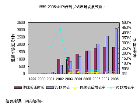 2000年以來(lái),IP長(zhǎng)話憑借明顯的資費(fèi)優(yōu)勢(shì),對(duì)傳統(tǒng)長(zhǎng)話形成了有力的競(jìng)爭(zhēng),在通話量上已趕超了傳統(tǒng)長(zhǎng)話。也正是由于IP長(zhǎng)話的低資費(fèi),在其通話量大幅度增加的同時(shí),也導(dǎo)致了國(guó)內(nèi)長(zhǎng)話網(wǎng)總體收入的下降,長(zhǎng)途電話IP化的趨勢(shì)十分明顯。總體而言,中國(guó)VoIP市場(chǎng)仍蘊(yùn)藏著非常大的潛力,按照3G和NGN的部署速度,