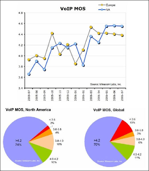 Minacom最新調(diào)研表明,一年來VoIP電話質(zhì)量和聯(lián)結(jié)速度都超過傳統(tǒng)標(biāo)準(zhǔn)公共開關(guān)電話。電話質(zhì)量得分Mean Opinion Score (MOS)數(shù)據(jù)表明,VoIP得分是4.2,而標(biāo)準(zhǔn)公共開關(guān)電話得分3.9。85%的IP電話質(zhì)量和穩(wěn)定性都超過標(biāo)準(zhǔn)公共開關(guān)電話。對(duì)電話聯(lián)結(jié)速度,VoIP的MOS得分是平均8.2秒,傳統(tǒng)電話時(shí)間更長,平均為8.9秒。這里的IP電話服務(wù)指商業(yè)企業(yè)級(jí)應(yīng)用,不是MSN,雅虎通之類免費(fèi)IP電話個(gè)人應(yīng)用。比較而言,北美IP電話質(zhì)量優(yōu)于歐洲。