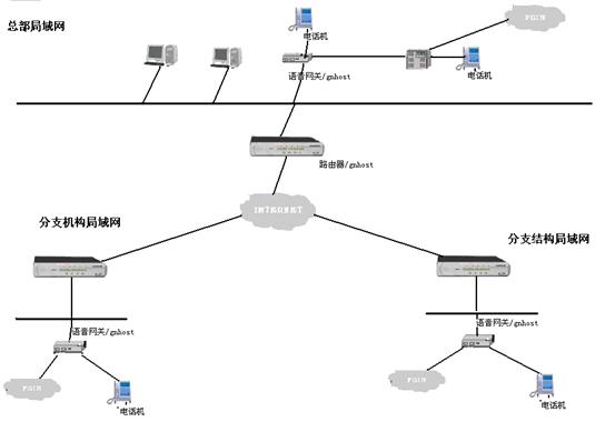 首先將VOIP電話網(wǎng)關(guān)的網(wǎng)絡(luò)接口接入到公司和分部(分公司)的局域網(wǎng)中,通過ADSL、ISDN、撥號上網(wǎng)等方式,同連接在此因特網(wǎng)上的其它VOIP電話網(wǎng)關(guān)相連,從而將不同地域的電話連接在一起,組成整個公司的IP電話網(wǎng),如果總部或分部有用戶程控交換機(jī),還可以將VOIP電話網(wǎng)關(guān)接入程控交換機(jī),使得整個交換機(jī)的分機(jī)都能利用IP網(wǎng)絡(luò)撥打免費(fèi)電話。如果這個VOIP設(shè)備具有PBX的功能。那么電話網(wǎng)關(guān)的多種接口還可以與電信(PSTN)相連,從而將專網(wǎng)的IP電話語音網(wǎng)與整個公網(wǎng)銜接成一個大的電話網(wǎng)絡(luò)。